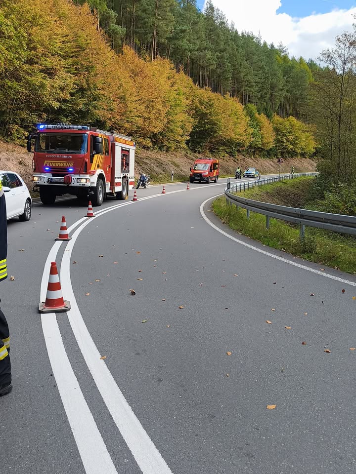 🚨 Einsatzinfo 🚨 . 📟 – THL 1 🗓 – 18.10.2025, 13:13 Uhr . Am gestrigen Samstag wurden wir zur späten Mittagszeit recht kurz vor Beginn unserer öffentlichen Wendelinusübung zu einem verunfallten Motorrad auf die B47 zwischen Boxbrunn und Amorbach alarmiert. Ersteintreffend betreuten wir zunächst priorisiert den Patienten bis Übergabe an den nachrückenden Rettungsdienst. Anschließend regelten wir den Verkehr einseitig und unterstützten bei der Bergung der verunfallten Maschine. Für die Dauer der Maßnahmen kam es kurzzeitig zu einer Vollsperrung der B47. . Im Einsatz 🚒 ffamorbach: HLF, MZF, MTW Bay. Rotes Kreuz: RTW PI Miltenberg . #feuerwehr #freiwilligefeuerwehr #ffw #verkehrsunfall #vumotorrad #vumitmotorrad #motorradunfall #technischehilfeleistung #technischehilfe