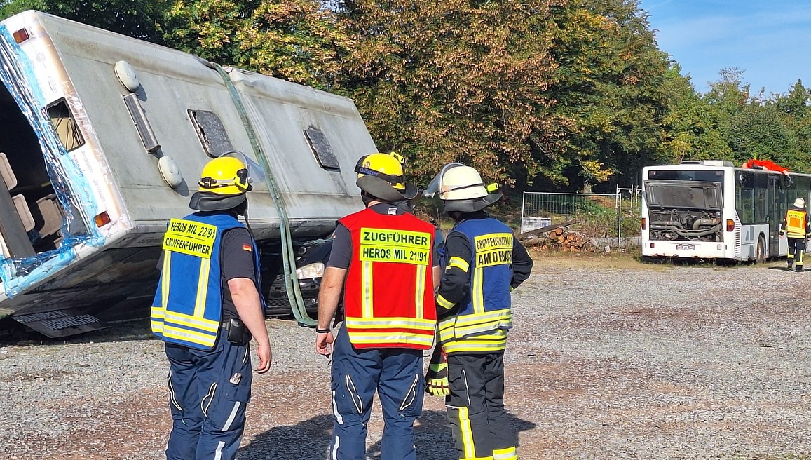 🚒 Gemeinschaftsübung 🚑 . Vergangenen Samstag beübten wir gemeinsam mit dem @thw_ortsverband_miltenberg sowie mehreren BRK Bereitschaften des @brk_miltenberg zwei umfangreiche Szenarien auf dem Übungsgelände der Feuerwehr der Stadt Klingenberg in Trennfurt. Die über 50 Einsatzkräfte aller drei Organisationen standen einer wahren Herausforderung gegenüber. Im ersten Szenario kam es zu einem folgenschweren Verkehrsunfall mit MANV-Lage, zwei Linienbussen und einem PKW. Neben der Befreiung eingeschlossener Fahrgäste mussten zur Rettung weiterer Personen und Bergung des PKW vielseitige Sicherungen eingesetzt werden. Auch die Drehleiter und der Teleskoplader kamen zur Rettung von Personen aus erhöhten Bereichen zum Einsatz. Im weiteren Verlauf wurde die Rettung mehrer Personen aus engen Schächten erforderlich, was unter enger Zusammenarbeit und einer feinen Abstimmung zwischen filigraner Arbeit und dem Einsatz schweren Geräts gelang. Ehrenamt ist bunt – so lautet wie jedes Jahr unser Motto. Nachdem alle Einsatzkräfte nach einer Stärkung wieder bei Kräften waren, folgte eine kurze Abschlussbesprechung sowie ein Ausblick auf neue Planungen im kommenden Jahr. Wir freuen uns darauf! 💪🏽 . #feuerwehr #ffw #freiwilligefeuerwehr #thw #technischeshilfswerk #rd #rettungsdienst #brk #bayerischesroteskreuz